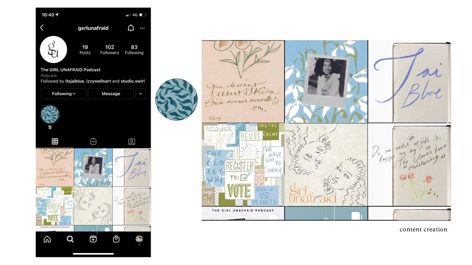 These visuals showcase a branding project to redesign the Girl Unafraid Podcast. Exploring different typography designs to represent Jai's textile background with an illustrative, journal approach.
